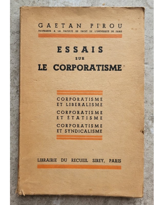 Corporatisme et Libéralisme Corporatisme et Étatisme Corporatisme et Syndicalisme. Publié en 1938, cet ouvrage de Gaëtan Pirou regroupe plusieurs essais sur le corporatisme, une doctrine socio-économique mêlant diverses conceptions de l'organisation du travail et de la société.Très rare.